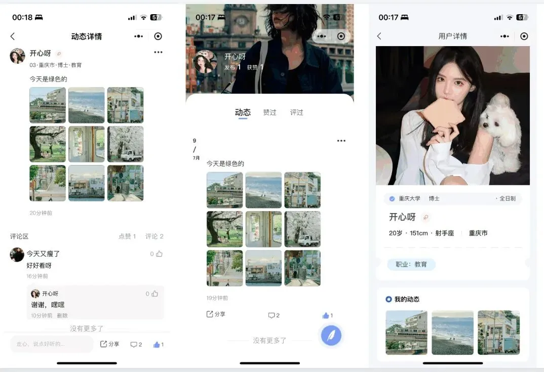 评论与点赞:在动态下方进行互动,增强用户粘性。