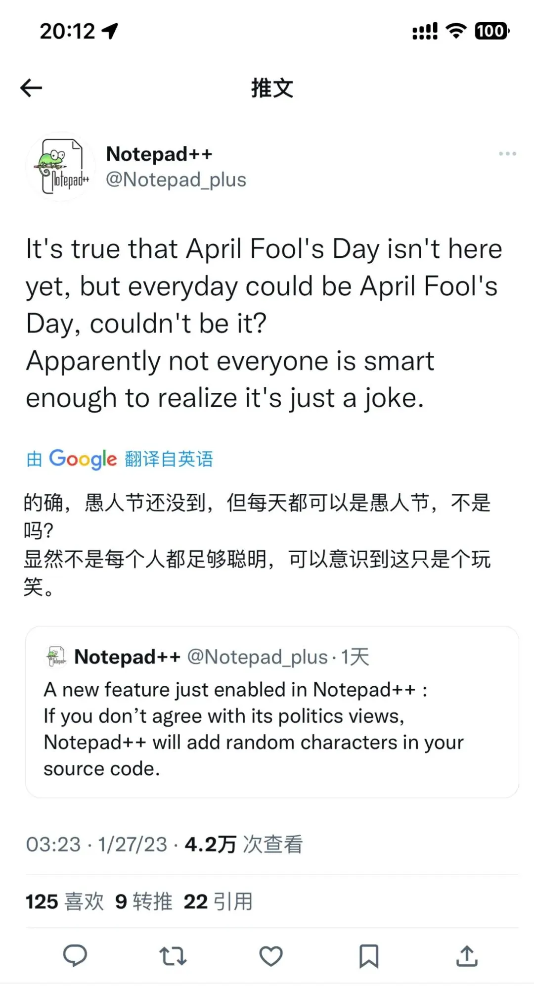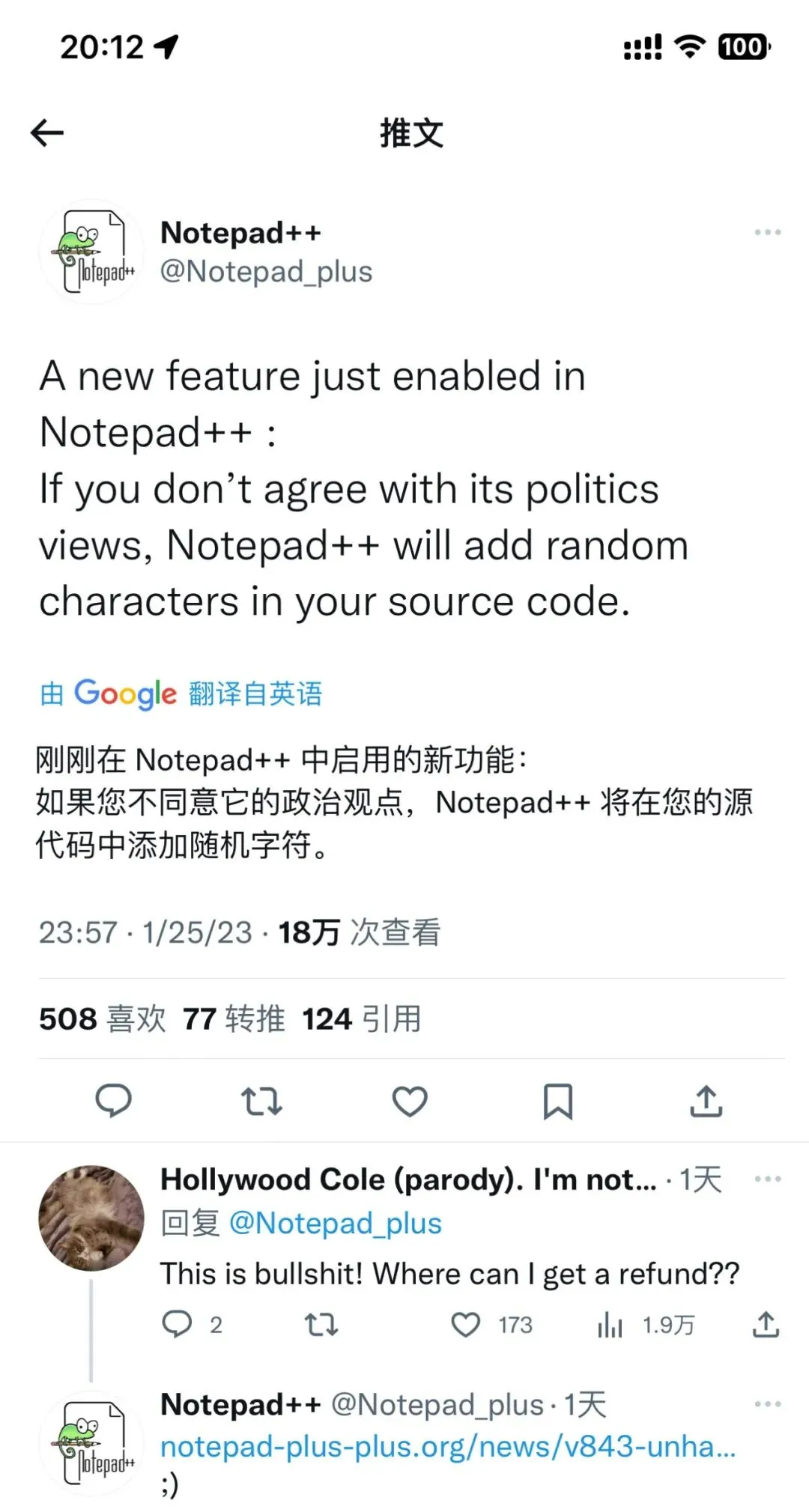 比如在最新的推特中其开发者称:如果你不同意 Notepad++ 的观点,那就往你的代码里掺上随机字符。这种做法显然已经触碰开发者们的底线,有开发者直接评论要退款方式,撤回自己此前对开发者提供的捐赠。