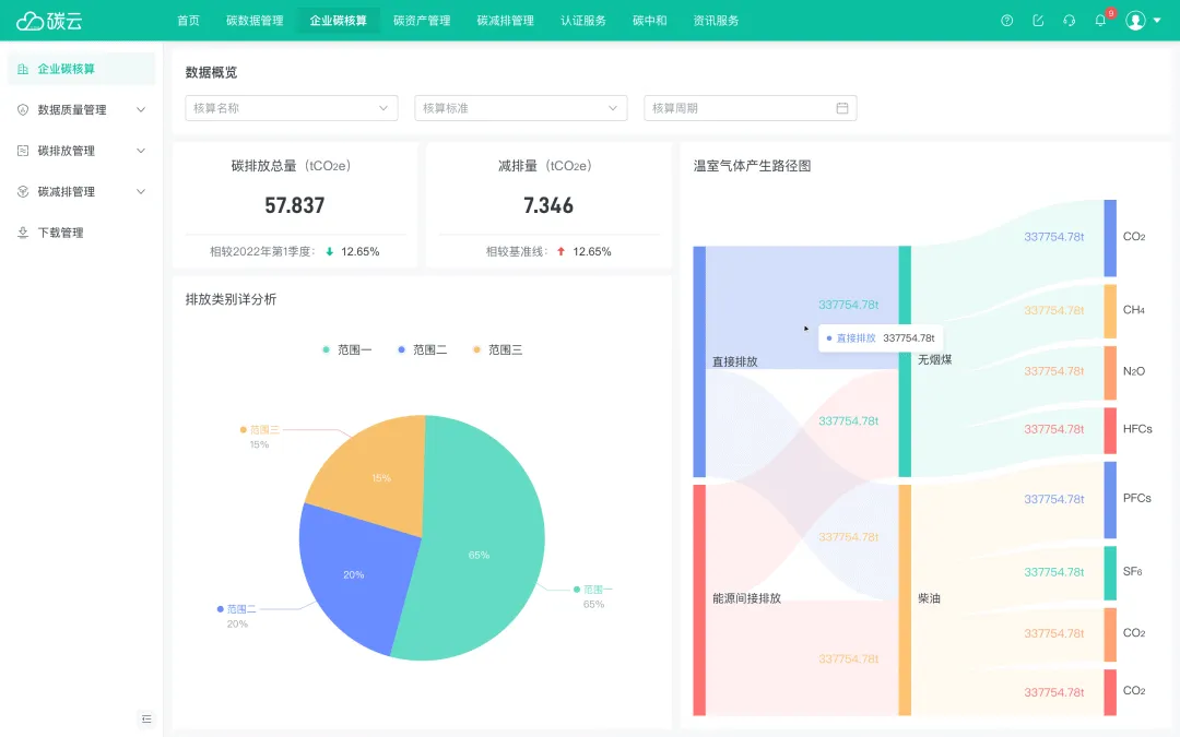 作为中国首个一站式碳管理平台以及企业实现碳中和的智能大脑,碳云涵盖企业碳核算、产品碳足迹、供应链碳管理、碳资产管理、碳账户平台、在线认证、碳中和服务等功能模块,并运用大数据和 AI 技术等服务能力,打通全链条碳管理路径,满足企业多种碳管理场景需求和体验,全方位提升企业整体碳减排成效。