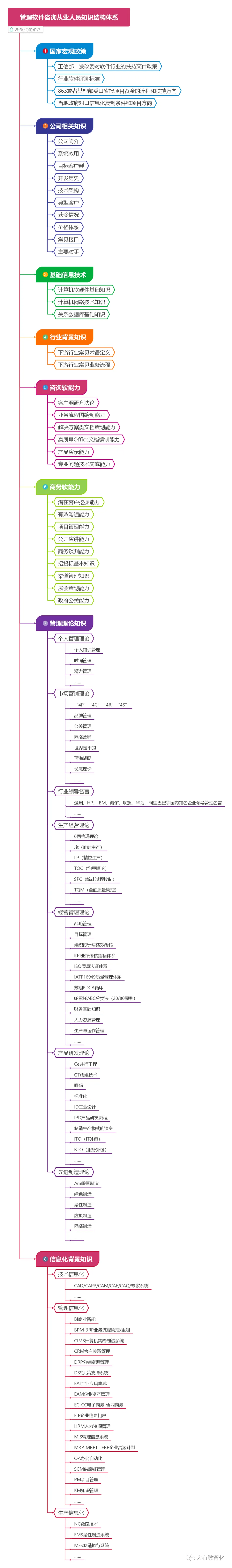 经常会在网络上遇到toC和toB争论的话题,最后经常谁也说服不了谁。toB对知识的广度和深度的要求确实挺高的,就拿管理软件咨询从业人员的知识结构体系来看,可窥一斑。个人想掌握全部知识,变的不太现实,所以就需要团队作战,各有分工协作。