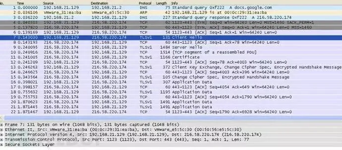 研究人员对软件进行深层分析时,发现存在一个mutex变量cuteRansomware,并对文件进行加密,在%TEMP%目录下创建一个文本文件,这个主要是受害者在安装恶意软件之后,被用于弹出赎金的提示信息,然后就是之前所述,加密受害者的文件,并生成密匙传至目标服务器,下图是分析受害者与Google Docs之间通信(SSL/TLS)协议。