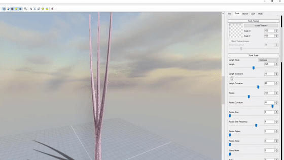 比如推动计数的话就可以得到更多的树枝,只需要不断调节数值就行。然后细分出来的树枝也可以进行一个简单的调节,可以减少或者增加尺寸、长度,反正就是取决于你对树木的一个想法和认知。为了直观性,用户也可以调节它的高度以便去找到一个最佳的角度。