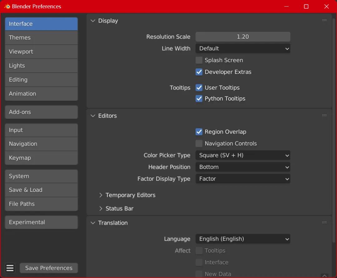 Save Preferences (保存设置),(你们的可能是 Save ,如果和我的不一样,点击左边的三条杠进去就有) 当你做了任何针对偏好设置的改动 ,比如调整了什么设置,安装了某个插件之后,都要点击这里保存设置 ,否则下次你打开软件,它会恢复原样的。