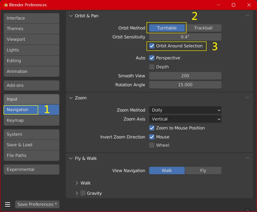勾选 Orbit Around Selection (3),这可以让你在建模时,以选中的模型为中心进行操作,在操作直觉上会舒服很多。