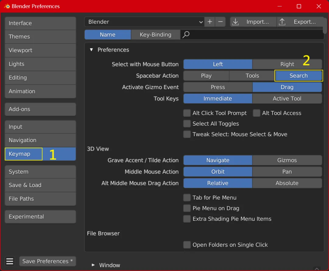 (2)处是定按下键盘空格键 的功能,默认应该是Play(播放),由于我们不太使用动画功能,所以可以改成 Search (搜索)。这样如果在使用中,忘记了某个功能在哪里,可以按下空格键然后输入来找到那个功能。
