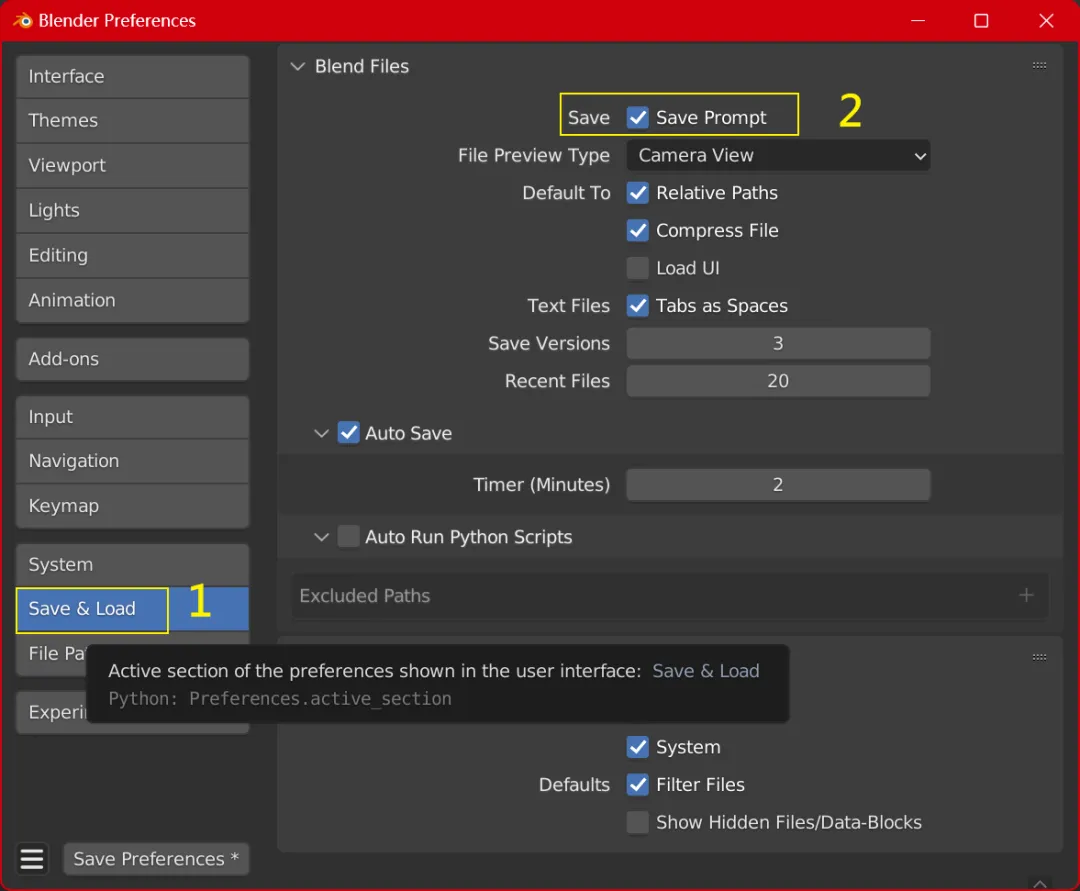 一定要勾上(2),这样你关掉 Blender 的时候,软件会提醒你是否保存文件(默认似乎是不提醒的,真的绝了这个用户体验 ) 。