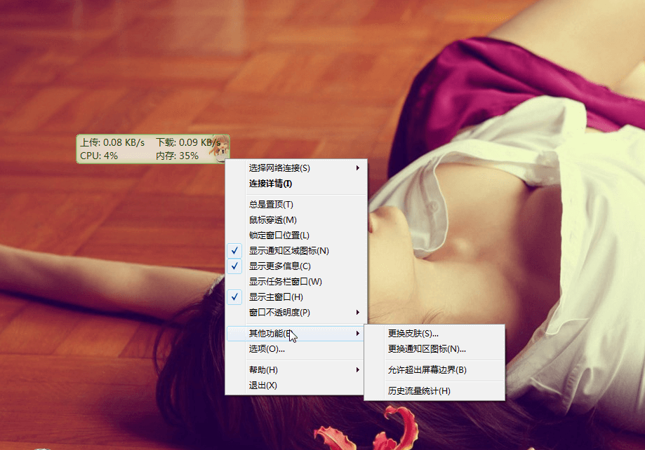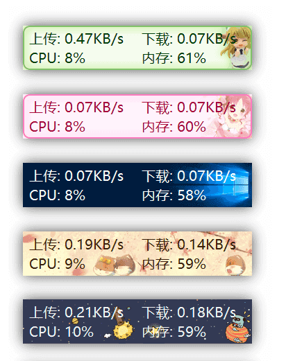 TrafficMonitor 是一款用于显示当前网速、CPU 及内存利用率的桌面悬浮窗软件,支持任务栏显示,并支持更换皮肤。皮肤工具默认自带了十几个,用户也可以在主题中获取更多主题,老夜认为默认自带的主题皮肤已经是很全面了,各种风格的都有,当然还有肥宅们都喜欢的卡哇伊皮肤,这点上确实要优于360悬浮球了。