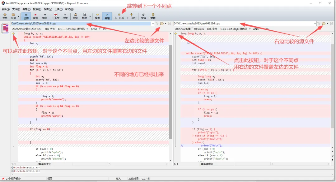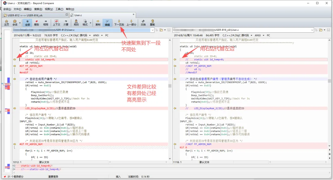 3. 比较两个文件的不同点。跳转到下一处不同点,或上一处不同点。对于不同点的地方,可以用左边文件内容覆盖右边文件内容,或者右边文件内容覆盖左边文件内容。如下图示。