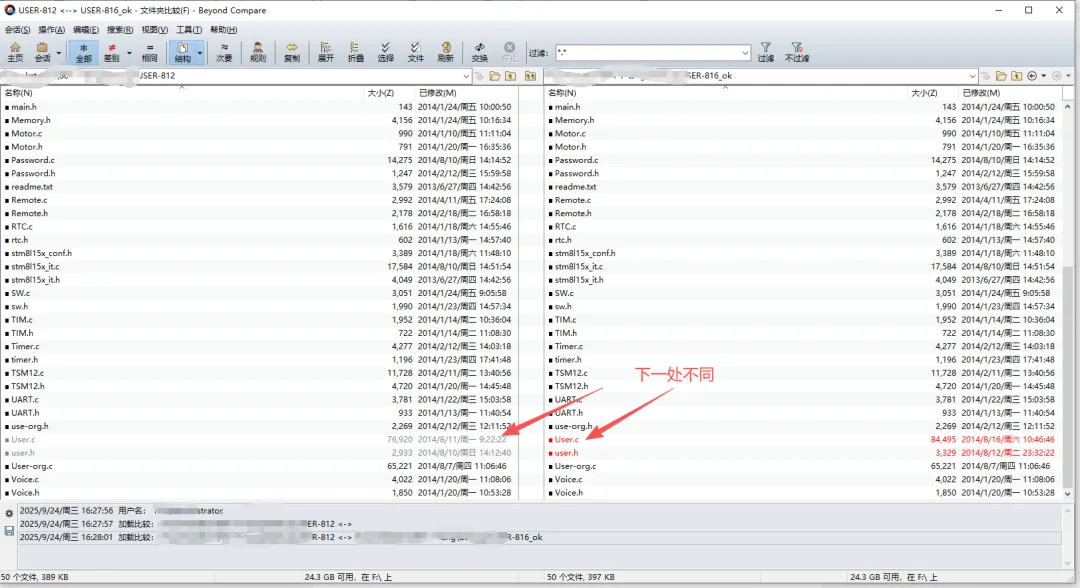 5. 由文件夹目录比较,双击高亮的有差异的文件,进入到单个文件比较。它会另外再生成一页新的独立的比较页面,使用者可以随时再返回原比较目录页进行另外文件的比较。