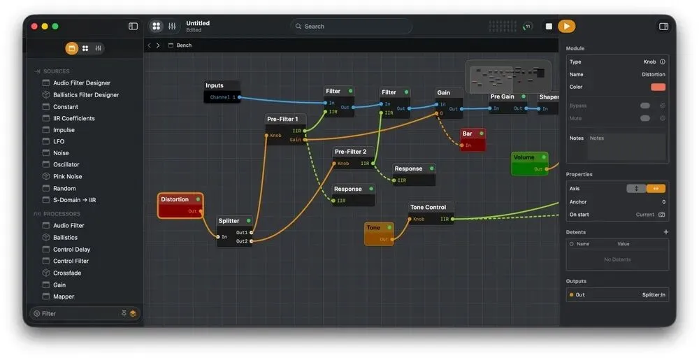INTJ Software 表示,该应用程序为音频设计引入了一种全新的视觉方法。它包含一组模块,每个模块代表一个概念——滤波器、延迟、声像器、失真、调制器、分析仪、振荡器、压缩器、电平表等一应俱全。用户可以连接多个模块来创建信号链,然后使用软件内置的工具来观察流经其中的信号,并了解每个部分如何塑造传入的声音。