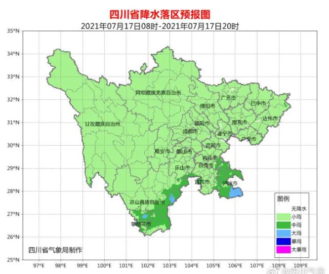 今天白天:盆地各市阴天间多云有阵雨或雷雨,其中广安、宜宾、泸州3市及资阳、内江、自贡3市东部、达州南部有中到大雨,局部暴雨;川西高原阴天间多云有阵雨或雷雨;攀西地区阴天间多云有阵雨或雷雨,其中南部有中到大雨,局部暴雨。