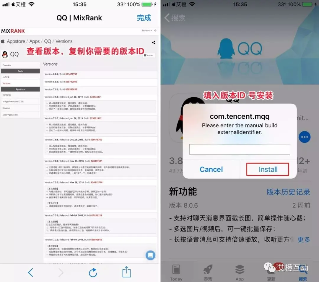 我们点击Upgrade/Downgrade,就会弹出应用的所有历史版本以及ID 号。选择你需要的版本,点击即可安装。等待片刻,你选择的应用版本就安装到手机了,非常简单轻松。