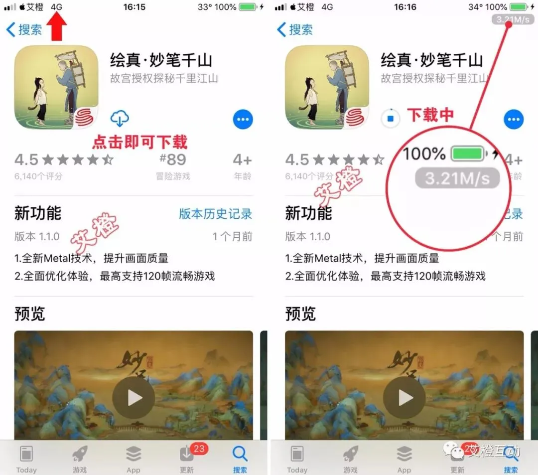 例如这款绘真妙笔千山,高达1.1GB 容量。在App Store 点击下载后,即可下载。