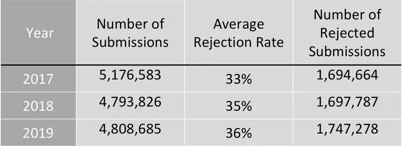 2017 年至 2019 年,苹果平均每年收到 500 万份应用提交,33%至 35%的提交应用被苹果审查团队拒绝。平均每年有 170 万个应用被拒绝,尽管根据审判证词,2020 年的拒绝率接近 40%。