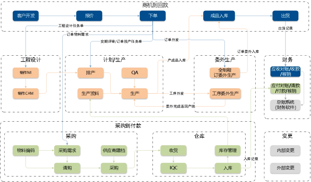 组织大了之后,组织的各项业务都应该有清晰的流程和标准,以保障组织机体能够有序运转,拉通组织各单元、各层级有序运转,消除管理“血栓”和“盲区”:商机到回款互通、采购到付款互通、工程/计划/生产互通、外部变更互通、内部变更互通、组织管理正向跟踪/逆向追溯……