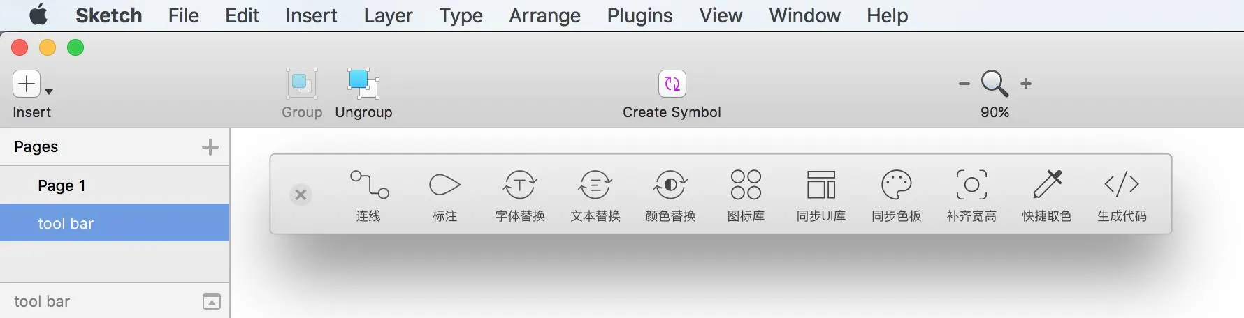 安装完成打开sketch后,默认语言为英文,需要在插件菜单中的Setting中设置为中文,此时插件即可完全中文化。同时Sketch会出现一个浮动工具条,如下图所示。