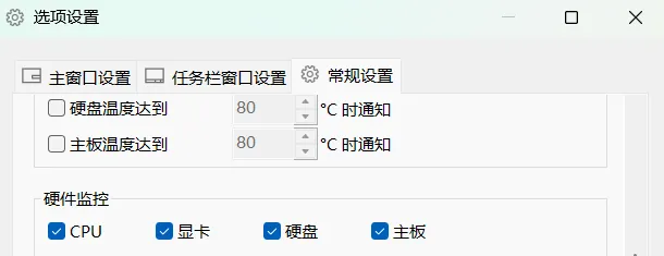还可以监测CPU、显卡、硬盘和主板的温度。右键菜单“选项”,来到“常规设置”就可以勾选监测显示。