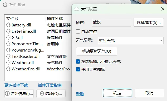 天气显示城市定位,悬浮窗右键菜单,“其它功能”,“插件管理”,选中“天气插件”,点击“选项”,弹框“天气设置”就可以选择你所在城市。