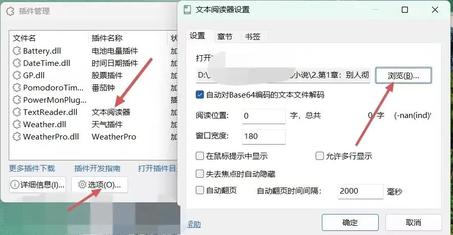 最值得一提的是它的文本阅读器,悬浮窗右键菜单,“其它功能”,“插件管理”,选中“文本阅读器”,点击“选项”,弹框“文本阅读器设置”,“浏览”选中你要看的TXT文本,比如TXT小说,隐藏在任务栏,简直就是打工族摸鱼神器!