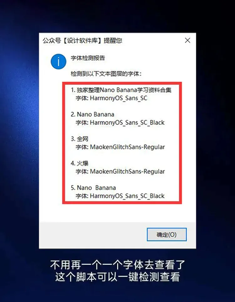 这是一款专门针对 PS 的字体检测脚本,它的核心功能很明确:一键检测图层里面的所有字体。操作特别简单,打开就能用