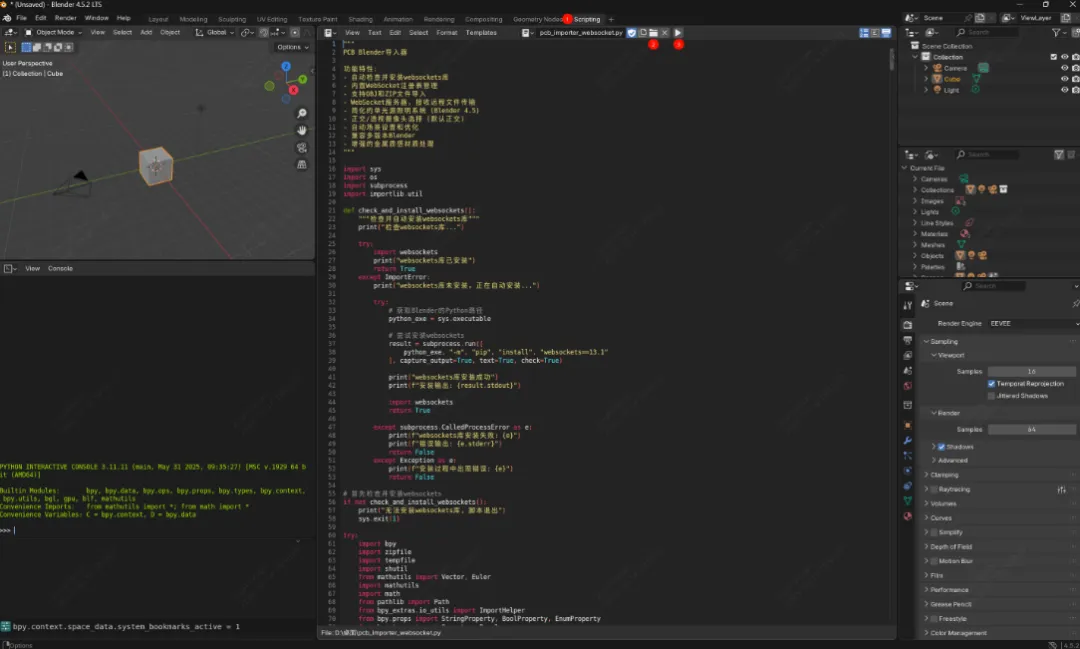 下载导入脚本:https://github.com/easyeda/eext-pcb-render-with-blender/blob/main/script/pcb_importer_websocket.py