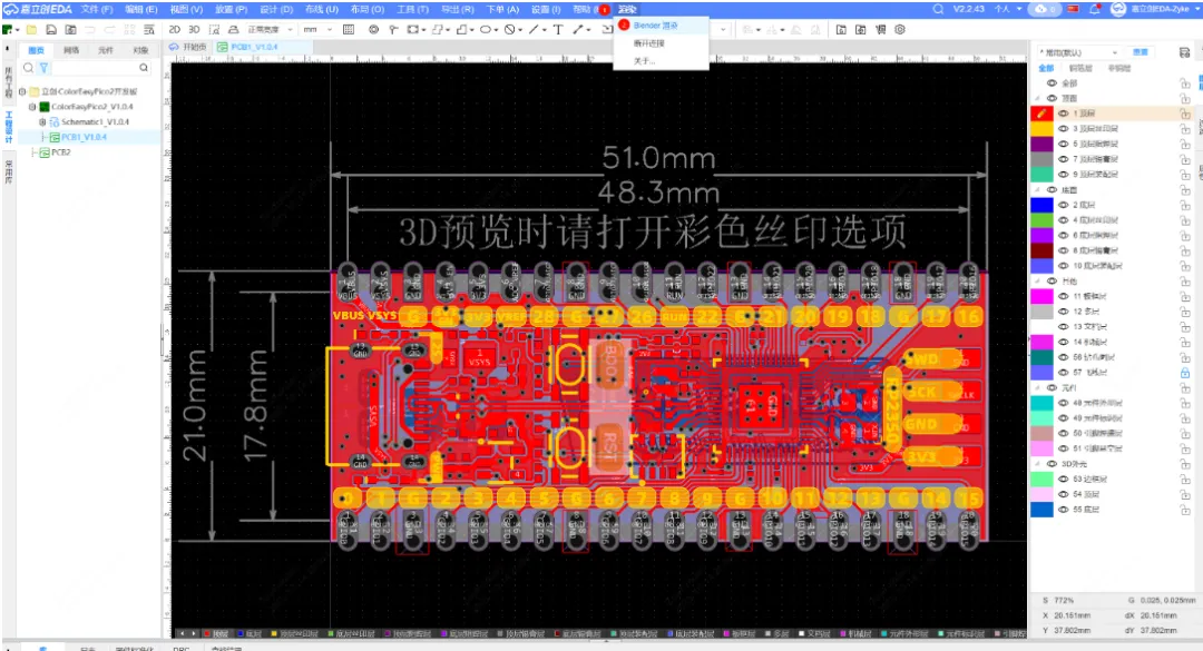 3D预览渲染扩展工具:https://ext.lceda.cn/item/oshwhub/pcb-render-with-blender
