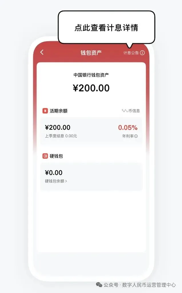 自2026年1月1日起,数字人民币实名钱包余额将按照活期存款挂牌利率计付利息。每季度末结息日之后,用户点击首页的钱包资产区域,进入钱包资产页,即可查看结息详情。