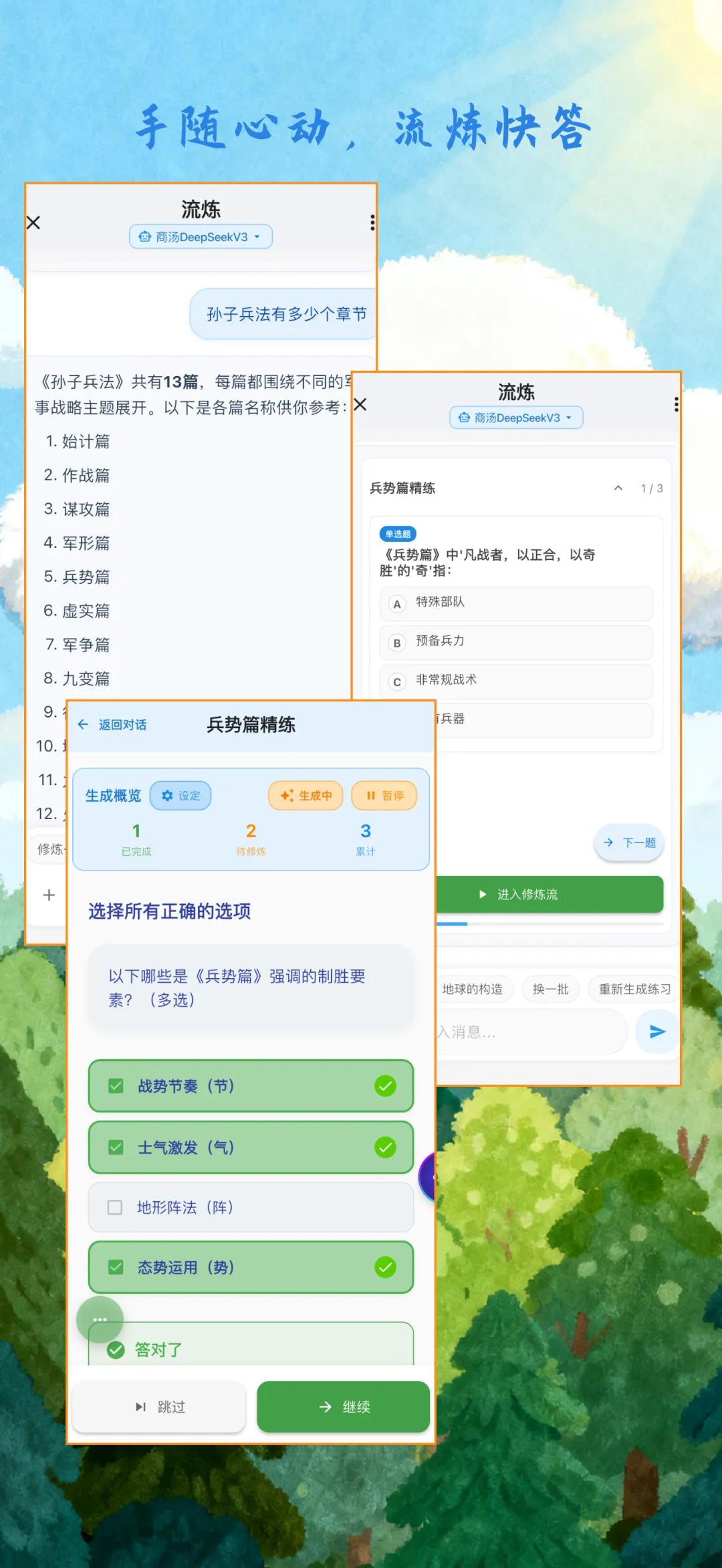 流炼功能源于自己使用APP的一个体验,我想针对某个知识点快速生成可练习的内容,单点突破,而宝典的使用显得过于重,它更强调体系化的练习,循序渐进。