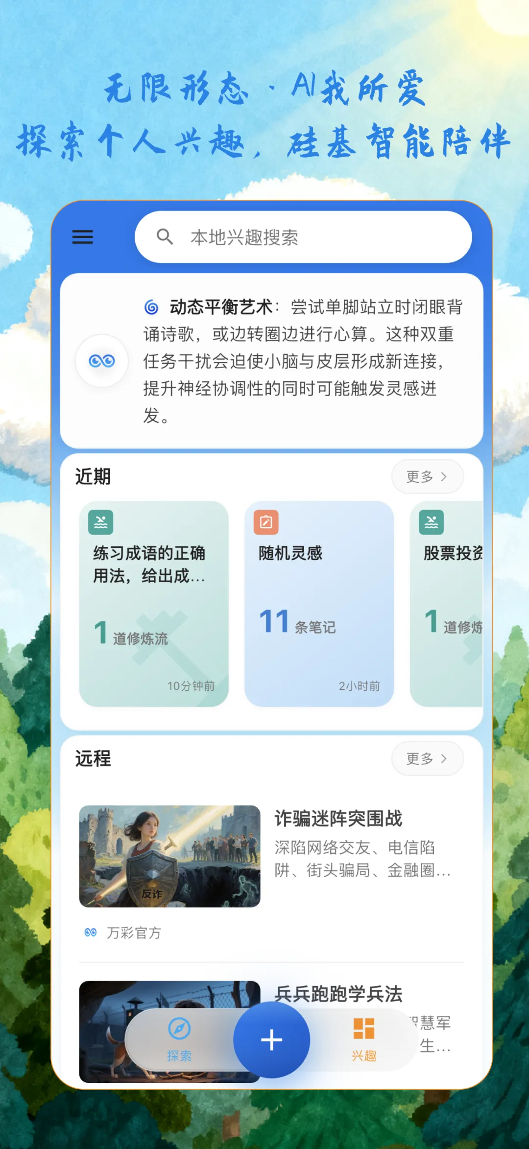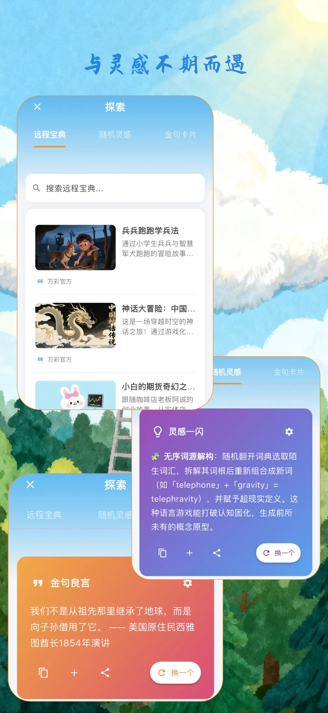 在“兴趣”之外,额外增加“探索”功能,除了整合原有的“远程”宝典,增加“随机灵感”、“金句卡片”功能,允许用户自定义要求,由AI来提供完全随机的个性内容。这部分目标,让用户不仅仅关注自己的“兴趣”,有机会邂逅“新知”。