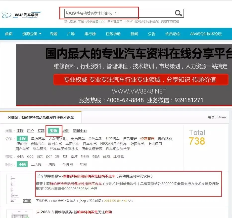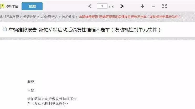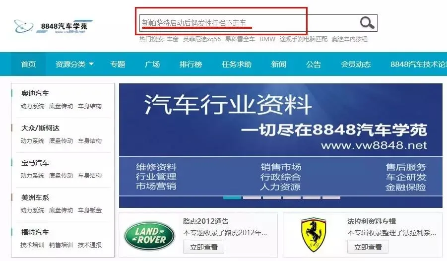 在上图中,显示的已经打开的网站首页,在搜索框内输入“新帕萨特启动后偶发性挂档不走车”,进入下图
