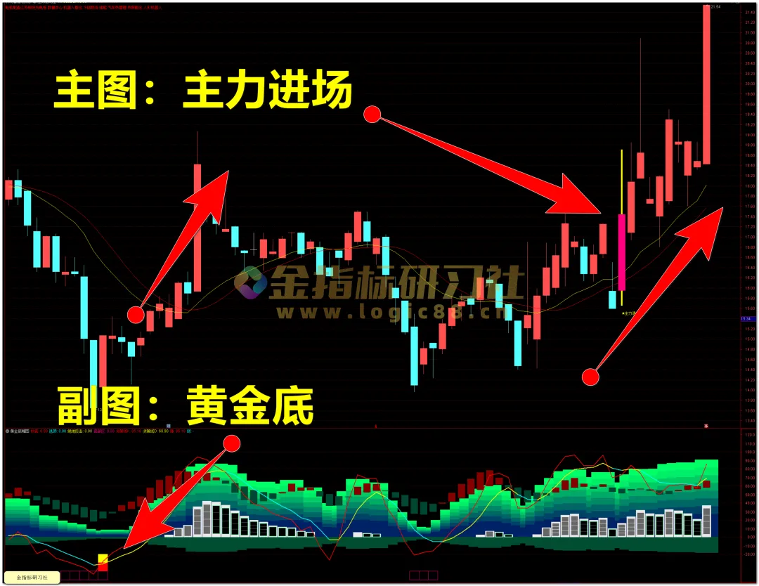 信号特征 :副图底部出现洋红色色块(代表进入底部区)。 紧接着出现 黄色柱子(绝地反击) 。或 红色柱子(抄底)此时股价通常经历了一波急跌。 操作 :信号出现当天尾盘或次日开盘,轻仓试错。这是博弈主力洗盘结束的第一根阳线,往往爆发力极强。