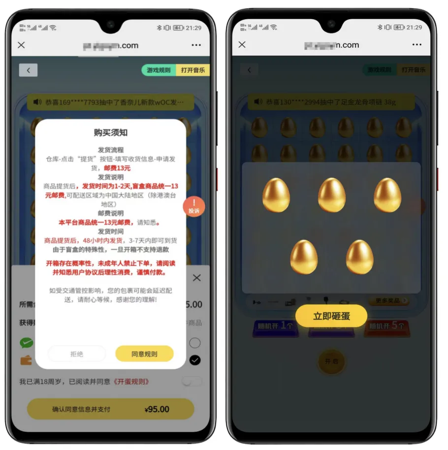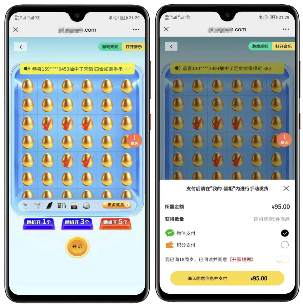 用户可选择“随机开1个、3个、5个”等不同开蛋方式,中奖结果实时展示,增强刺激感与透明度。