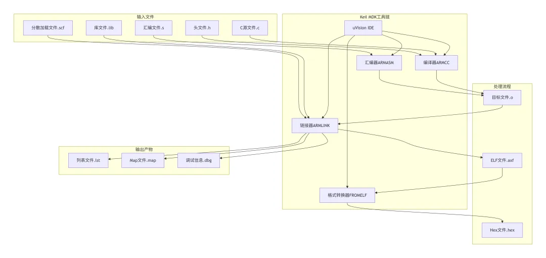 在深入分析编译过程的每个环节之前,我们先从宏观角度了解Keil MDK工具链的整体架构。下图展示了从源代码到最终Hex文件的完整处理流程,涵盖了所有参与的工具和它们之间的数据流关系:
