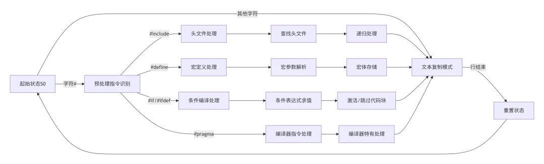 预处理器是编译过程的第一步,它处理源代码中的预处理指令。下图展示了预处理器如何通过状态机模型识别和处理不同类型的预处理指令: