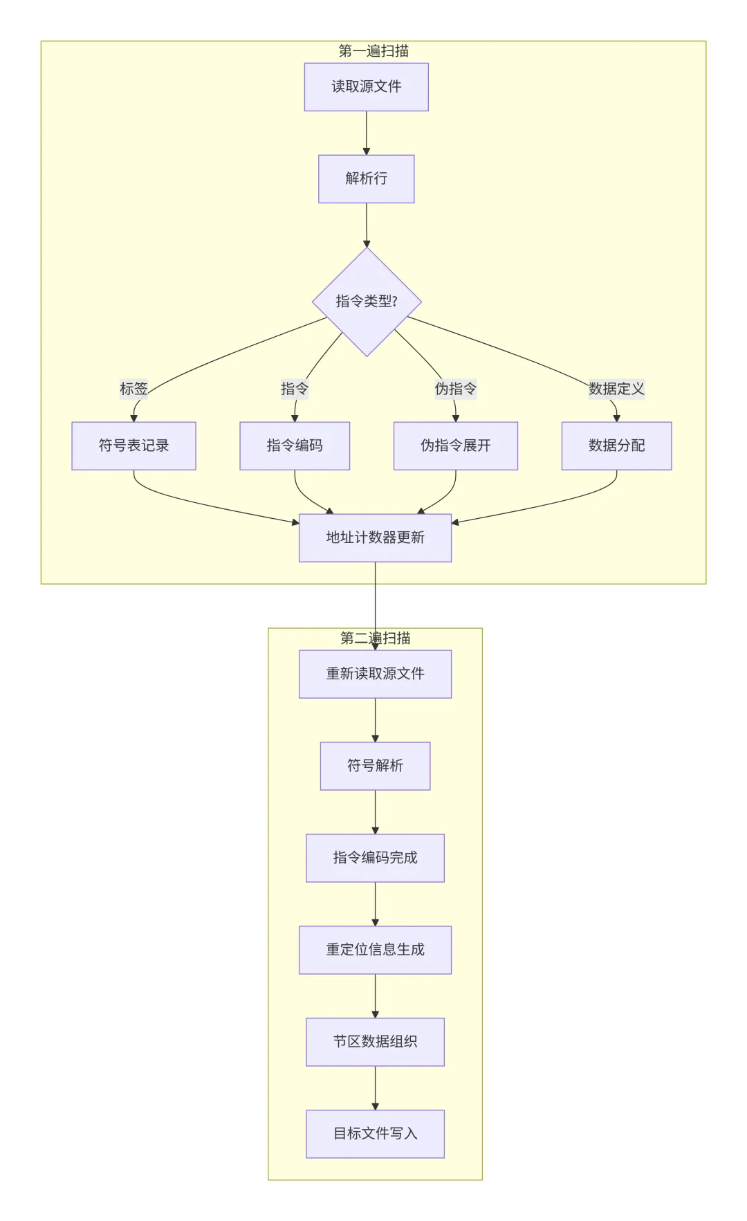 汇编器将汇编源代码转换为目标文件,这个过程通常需要两遍扫描。下图展示了汇编器的完整工作流程:
