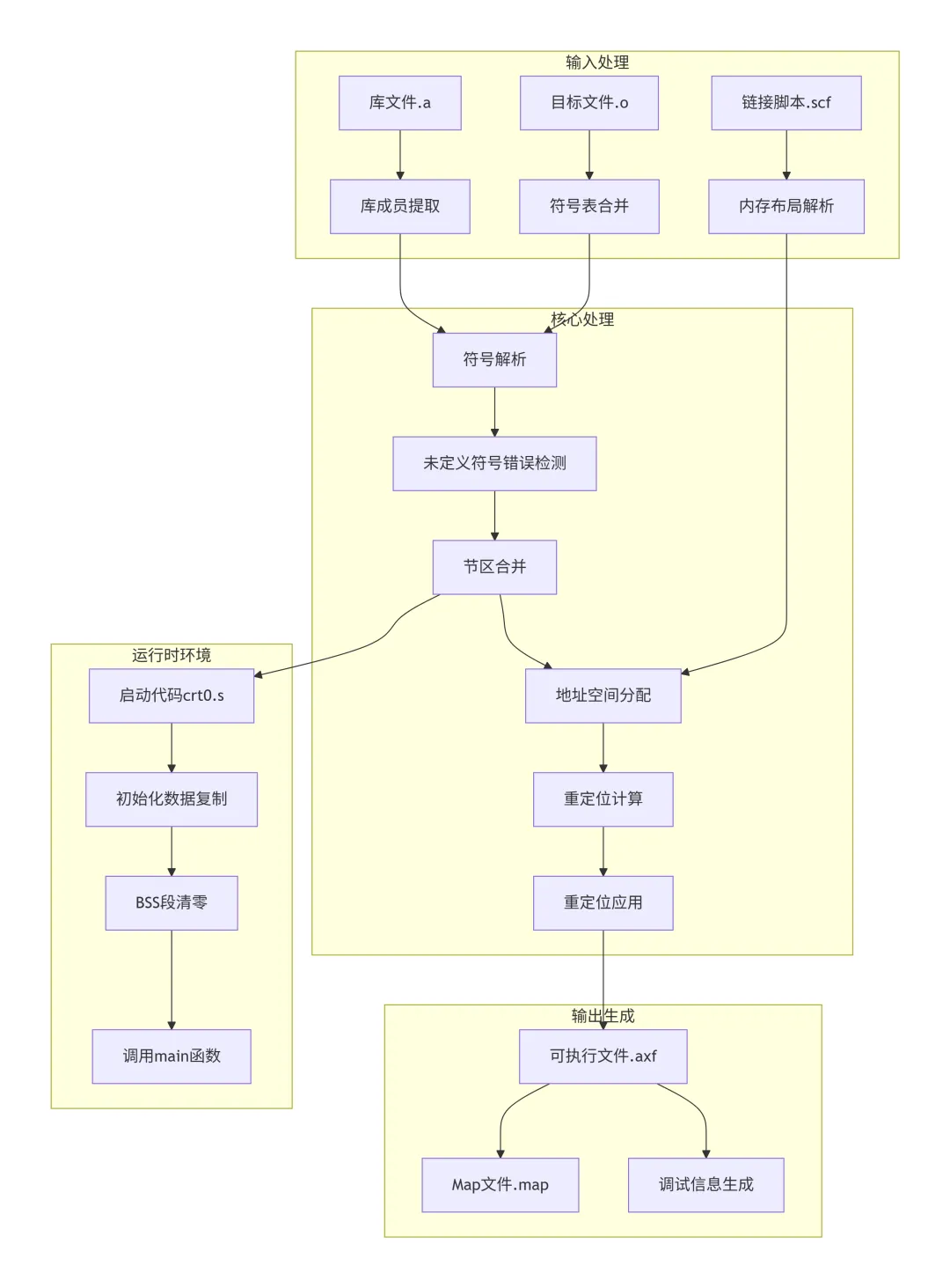链接器是编译过程的枢纽,它将多个目标文件合并为单一的可执行文件。下图展示了链接器的完整处理流程:
