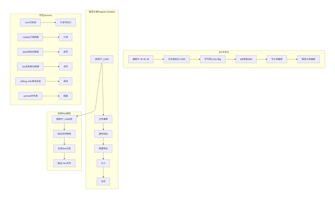 FROMELF工具将ELF格式的可执行文件转换为Intel Hex格式。要理解转换过程,首先需要了解ELF文件的结构。下图展示了ELF文件的各个组成部分:
