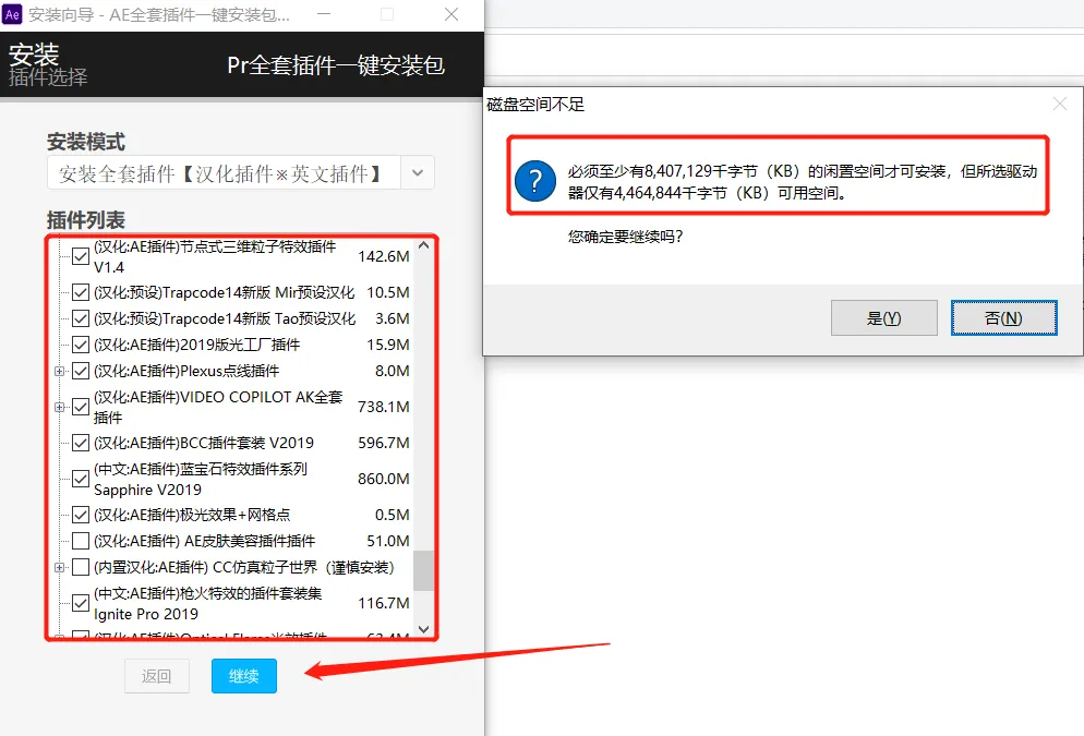 选择其中一种安装模式,勾选所需的插件、脚本以及转场等,这里建议大家不要都勾选,用什么就选择什么。