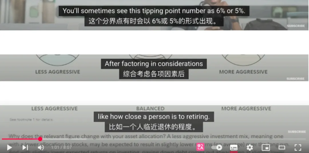 而使用了沉浸式翻译的“AI翻译”功能,可以根据整段话的意思把字幕翻译得更加准确。