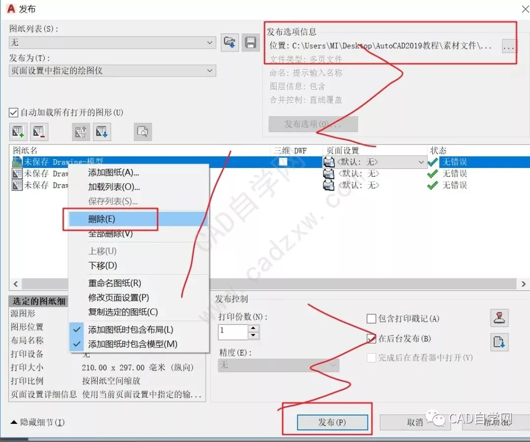删除不需要打印的图纸,选择保存位置,点击发布;