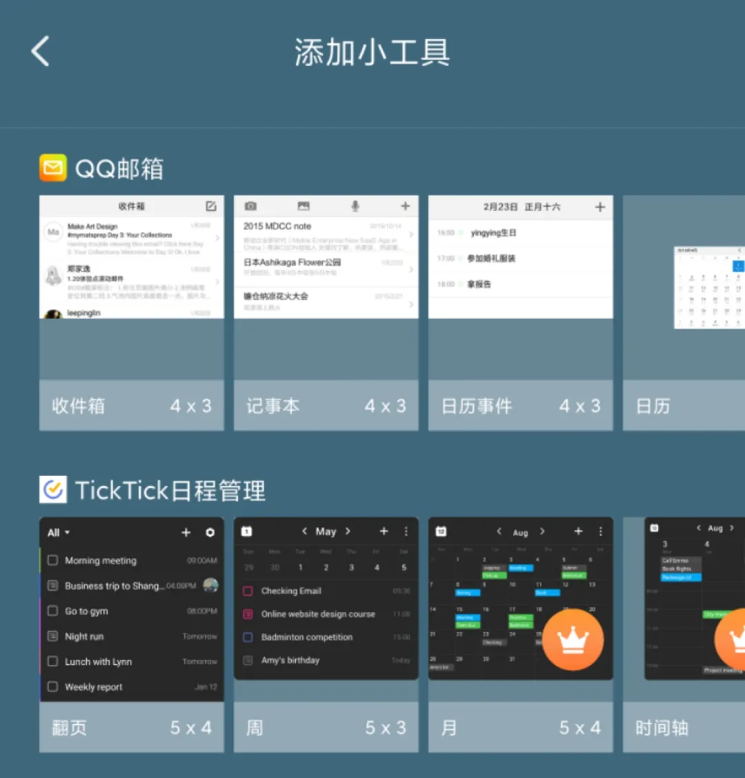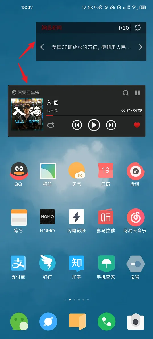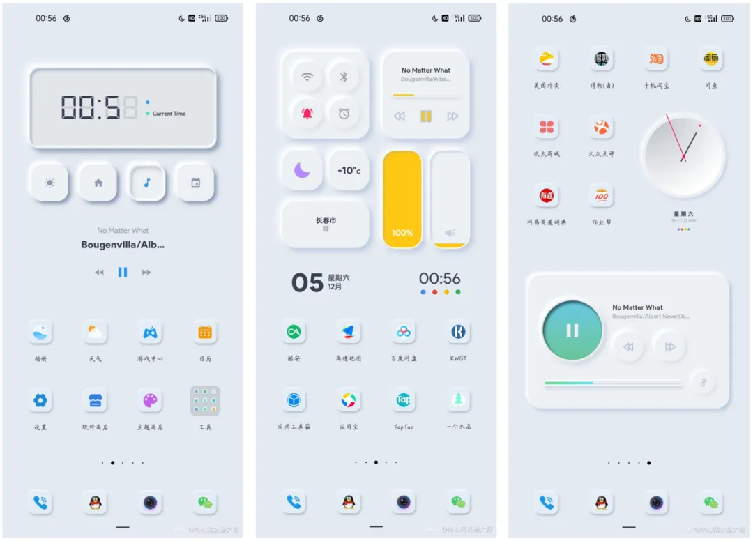 但是一旦我们想要添加任何小部件或者小工具在手机桌面上,这种统一的视觉风格就会立马被这些元素给打破,正如下面两个小组件一样: