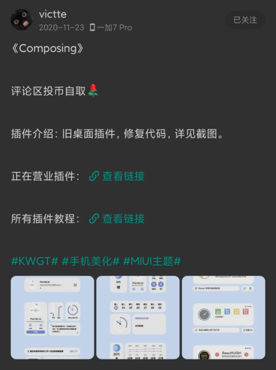 KWGT 在酷安有一个单独的话题讨论区,在这里你不仅能找到 KWGT 软件的安装包,还可以看到酷友们自己制作并且打包好的各种 KWGT 美化插件。