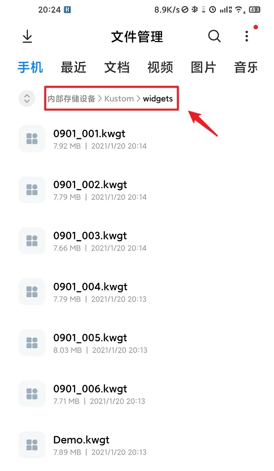 差友们在下载好 KWGT 软件和自己找到的 KWGT 美化插件后,首先需要把后缀名为 .kwgt 的插件导入到 kustom/widgets 文件夹。