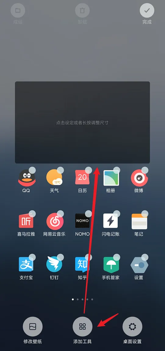 然后长按桌面,在添加工具选项里添加一个空白 KWGT 工具到桌面,并且调整好它的大小尺寸。