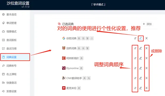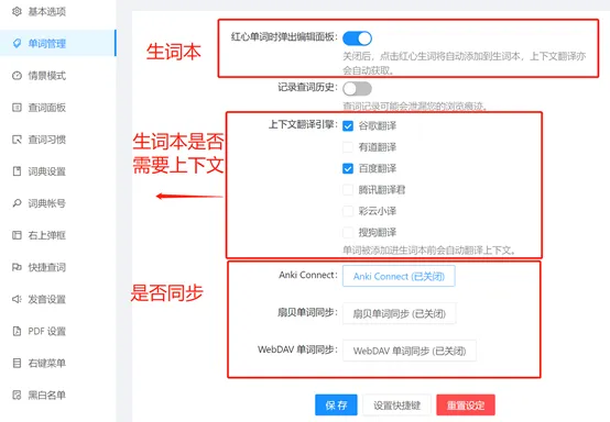 2)词典设置 不同词典有其优劣势,如何更好地适配你的需求,或许你可以考虑下,哪些词典满足,哪些词典不那么重要,甚至可以删掉。同时,这也会直接影响翻译的显示界面。