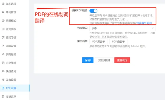 通常来说,因安全原因,插件是访问不了浏览器自带的 PDF浏览功能板块,但得益于pdf.js(一个基于Web标准的通用平台,用于解析和呈现PDF),沙拉查词自带了一个 PDF 阅读器,进而实现对在线浏览的PDF进行划词翻译。