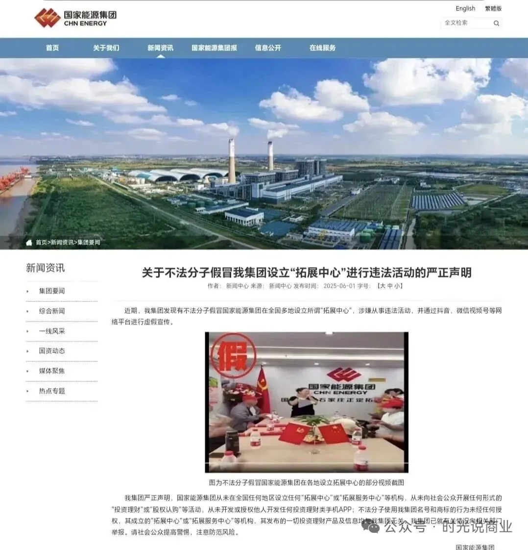 事实上,国家能源集团早在2025年6月就发布严正声明:从未设立”拓展中心”,从未开发投资理财APP,也未开展任何个人理财、股权认购活动,相关骗局已向有关部门举报。