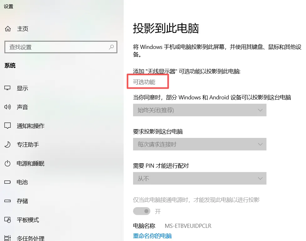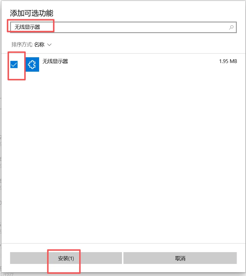 步骤二:在弹出的“添加可选功能”页面,添加搜索无线显示器,点击“安装”;