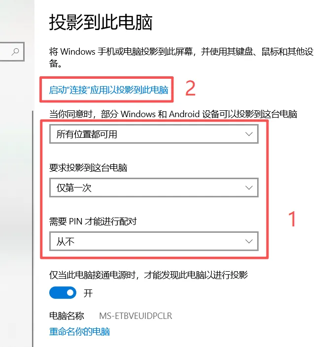 步骤三:把下图红框处的可选项按下图所示选好后,再点击“启动“连接”应用以投影的此电脑”;
